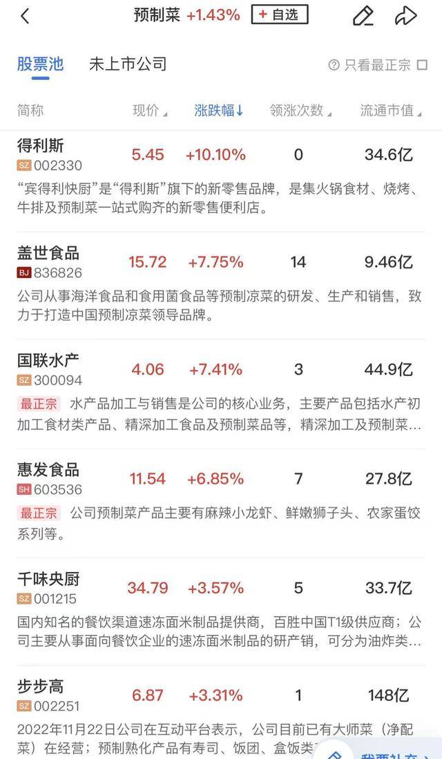 预制菜概念股活跃,得利斯涨停,盖世食品、国联水产、惠发食品、天康生物等个股涨幅居前。消息面上,国家卫健委主导的《预制菜食品安全国家标准》草案已通过专家审查,即将向社会公开征求意见。 届时,预制菜“身份”将有统一说法,餐饮门店是否使用、如何使用预制菜,也将首次纳入强制信息披露范畴。