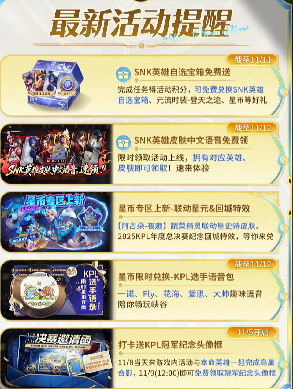最后再来看看王者最新的福利,为总决赛而诞生的福利,不容错过哦,比如SNK英雄自选宝箱免费送,登录游戏获得活动积分,就可以了,任务很简单,还有元流时装、星币等好礼。还有SNK中文语音免费领,蔬菜精灵联动星史诗皮肤,总决赛纪念回城特效,明星选手的趣味语音等,另外,决赛当天,还有冠军纪念头像框,只要和本命英雄一起完成鸟巢合影即可。快去感受吧。返回搜狐,查看更多