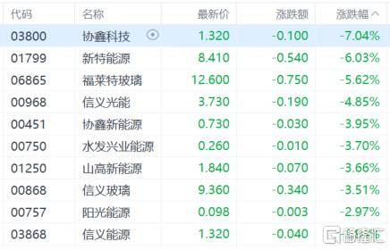 光伏大跌,协鑫科技跌超7%,新特能源跌超6%,福莱特玻璃跌超5%,信义光能跌超4%,山高新能源、信义玻璃等跟跌。