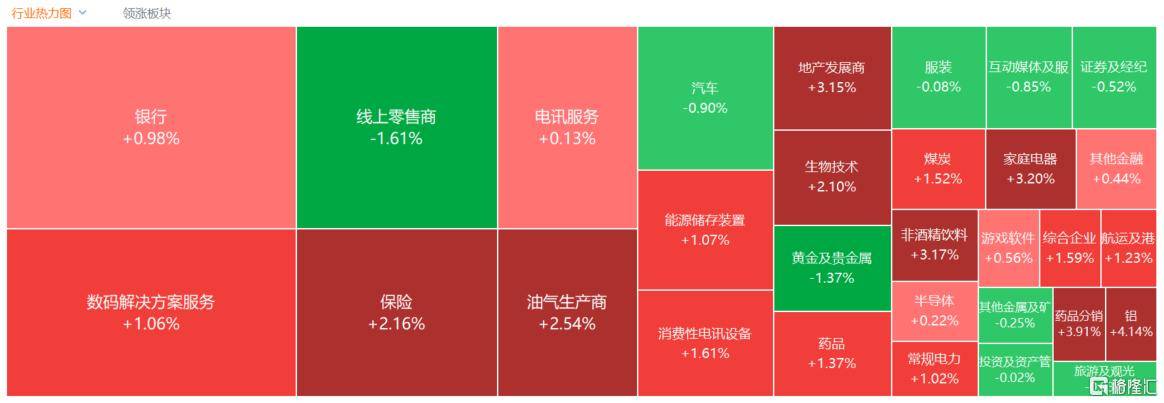 盘面上,大型科技股呈现涨跌不一行情;内银股、石油股、保险股等权重表现活跃,尤其是工商银行、农业银行、中国海洋石油均创历史新高;家用电器双11销量亮眼,海信家电涨7%领衔家电股上涨,生物医药股、濠赌股、脑机接口概念股纷纷上涨。另一方面,中国光伏行业协会声明,网络流传的小道消息均为不实信息,光伏股全天疲弱,稀土概念股、黄金股普遍走低。