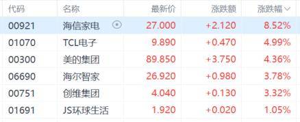 家电股齐涨,海信家电涨超8%,TCL电子、美的集团涨超4%,海尔智家、创维集团等跟涨。