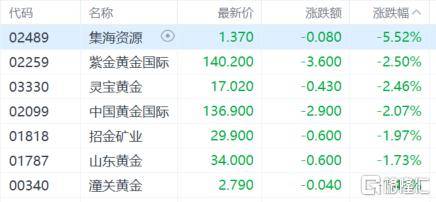 黄金股普跌,集海资源跌超5%,紫金黄金国际、灵宝黄金、中国黄金国际跌超2%,招金矿业、山东黄金、潼关黄金等跟跌。