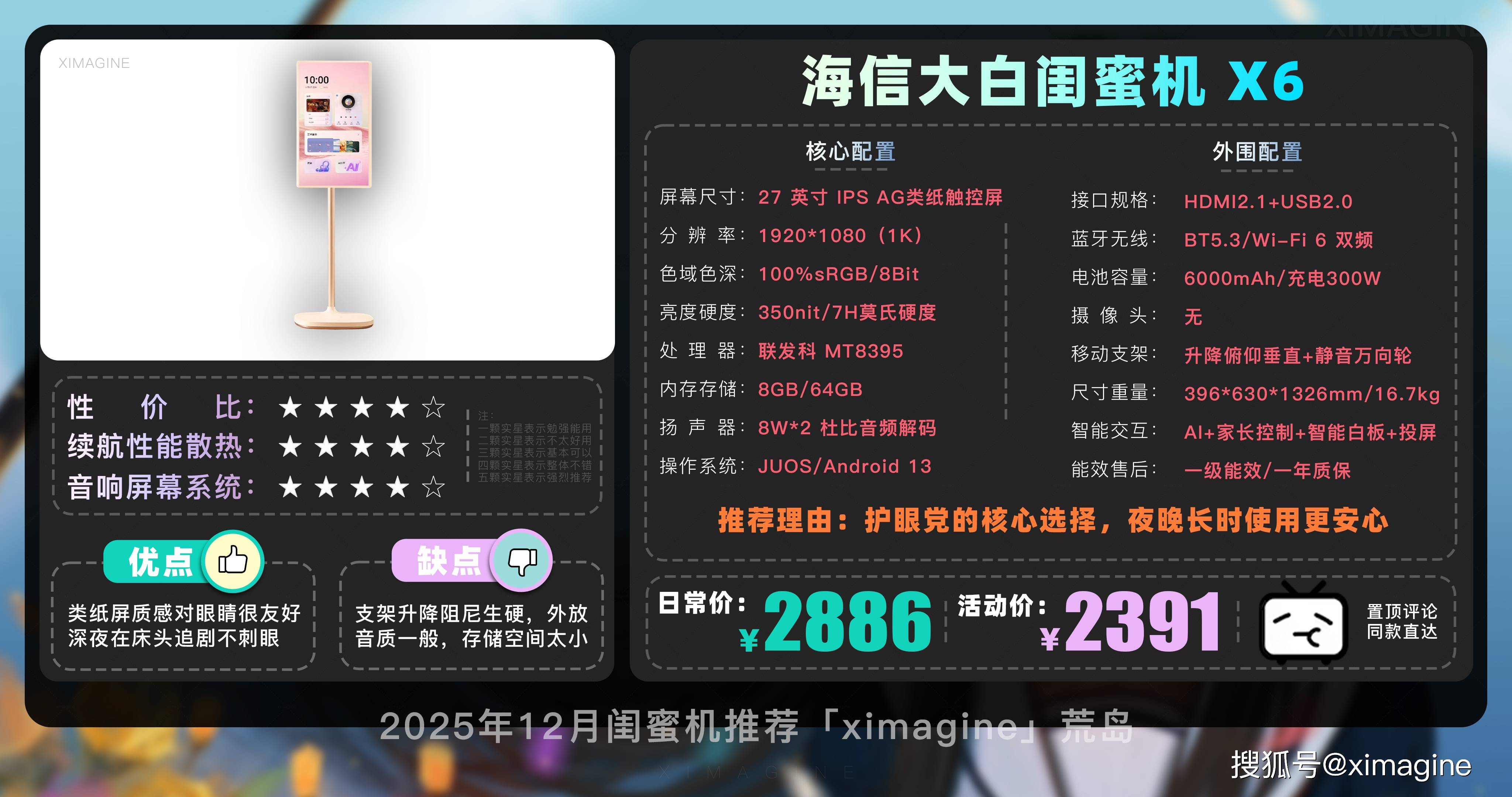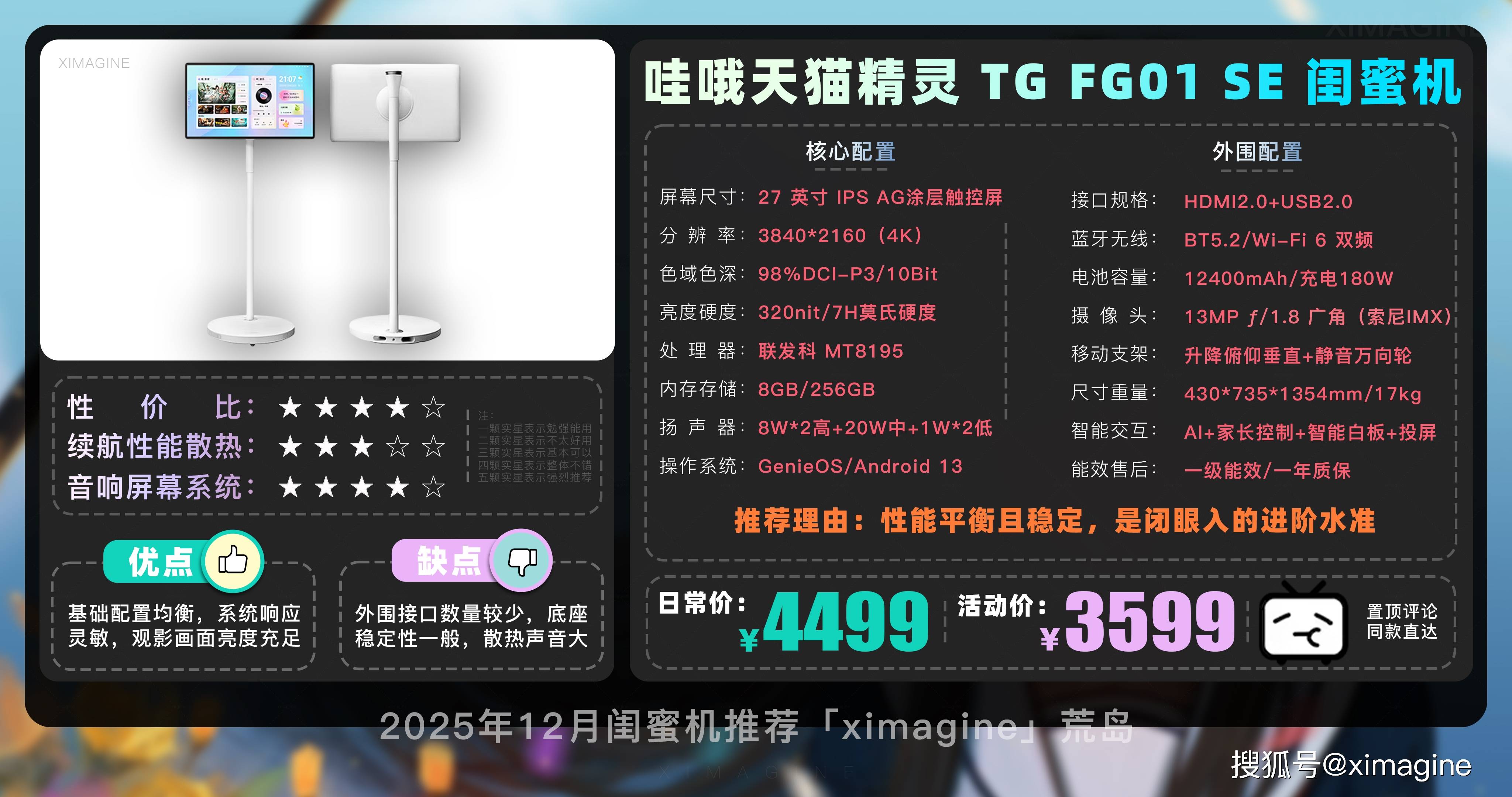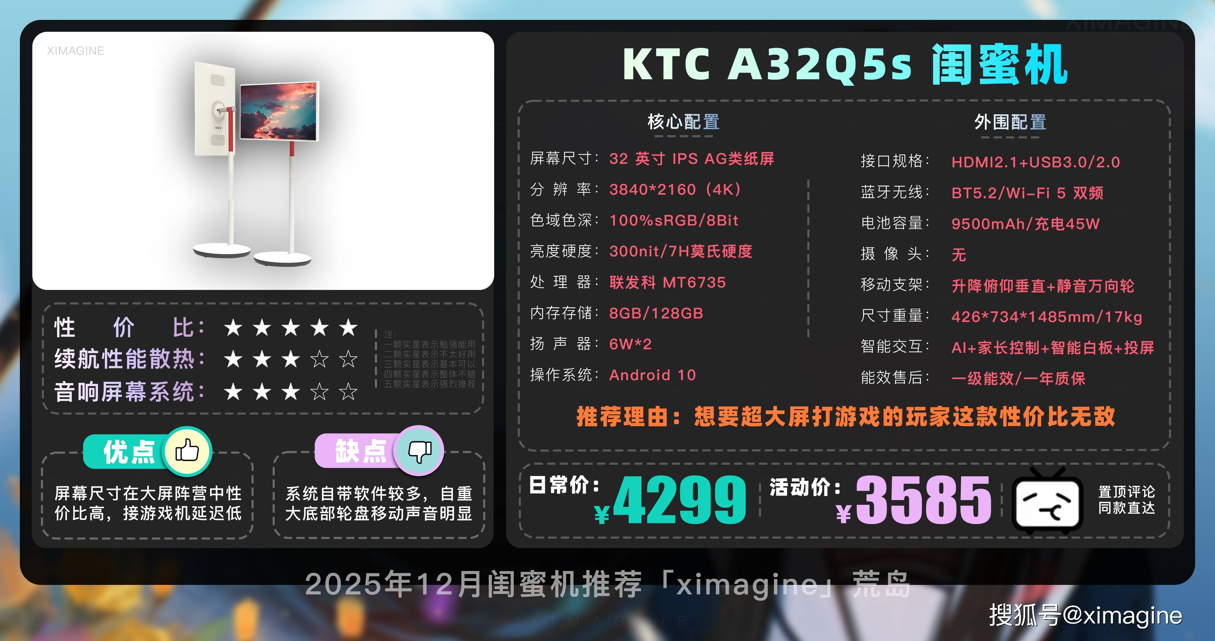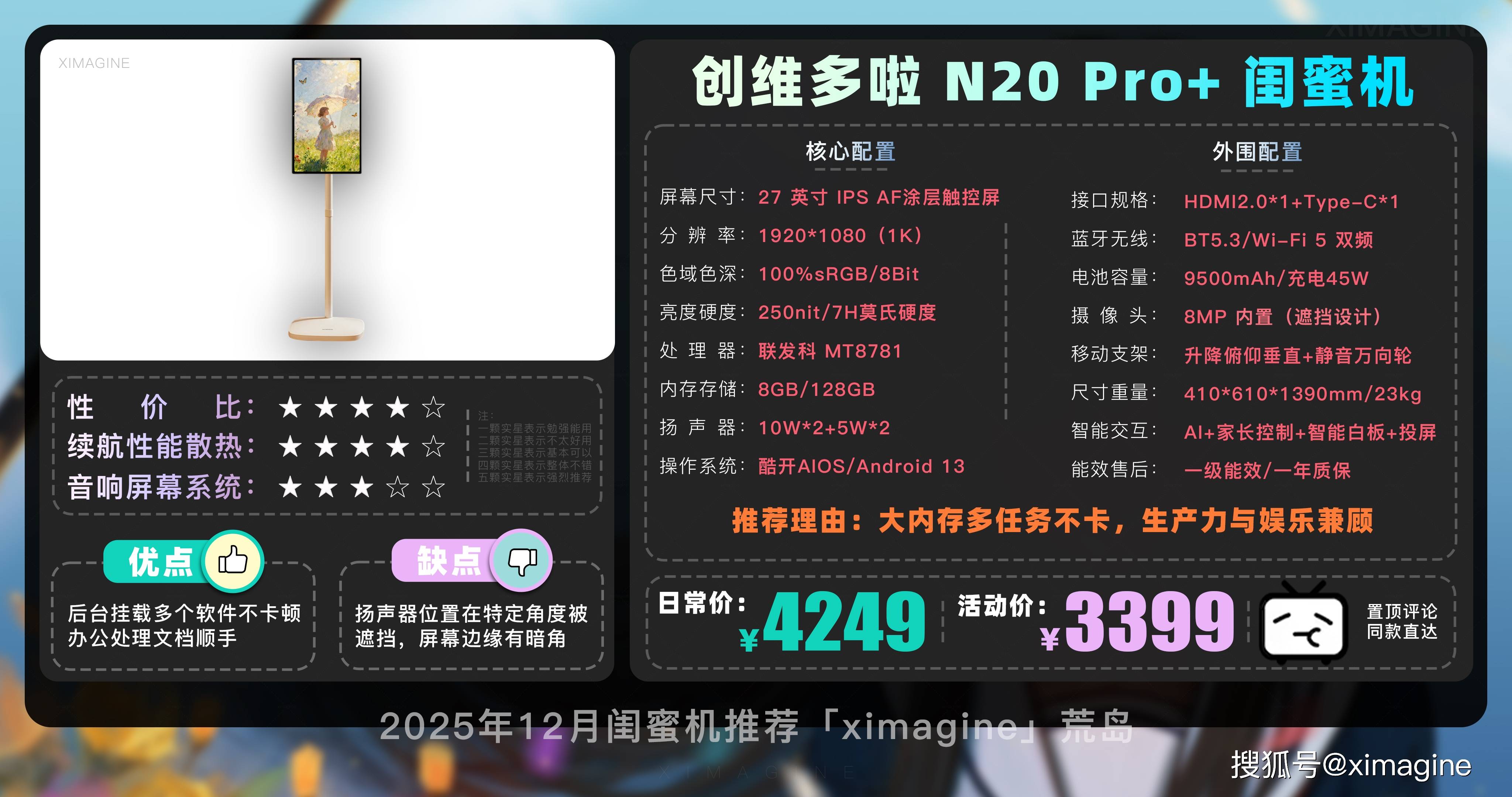 以上就是本期25年12月直播闺蜜机推荐清单,如果有心水的型号,可以戳置顶评论区对应链接拿下!如果只是想在出租房里有个下饭搭子,预算三千以内那些轻便系统简单的型号完全够用,如果对生活品质有执念,那四千元档位的全能型选手才是真命天子,至于追求极致画质和 AI 黑科技的朋友,一步到位旗舰款确实能让感受到科技带来的掌控感,本期就到这,如果觉得内容有所帮助,请三连支持!我是「ximagine」下期再会!返回搜狐,查看更多