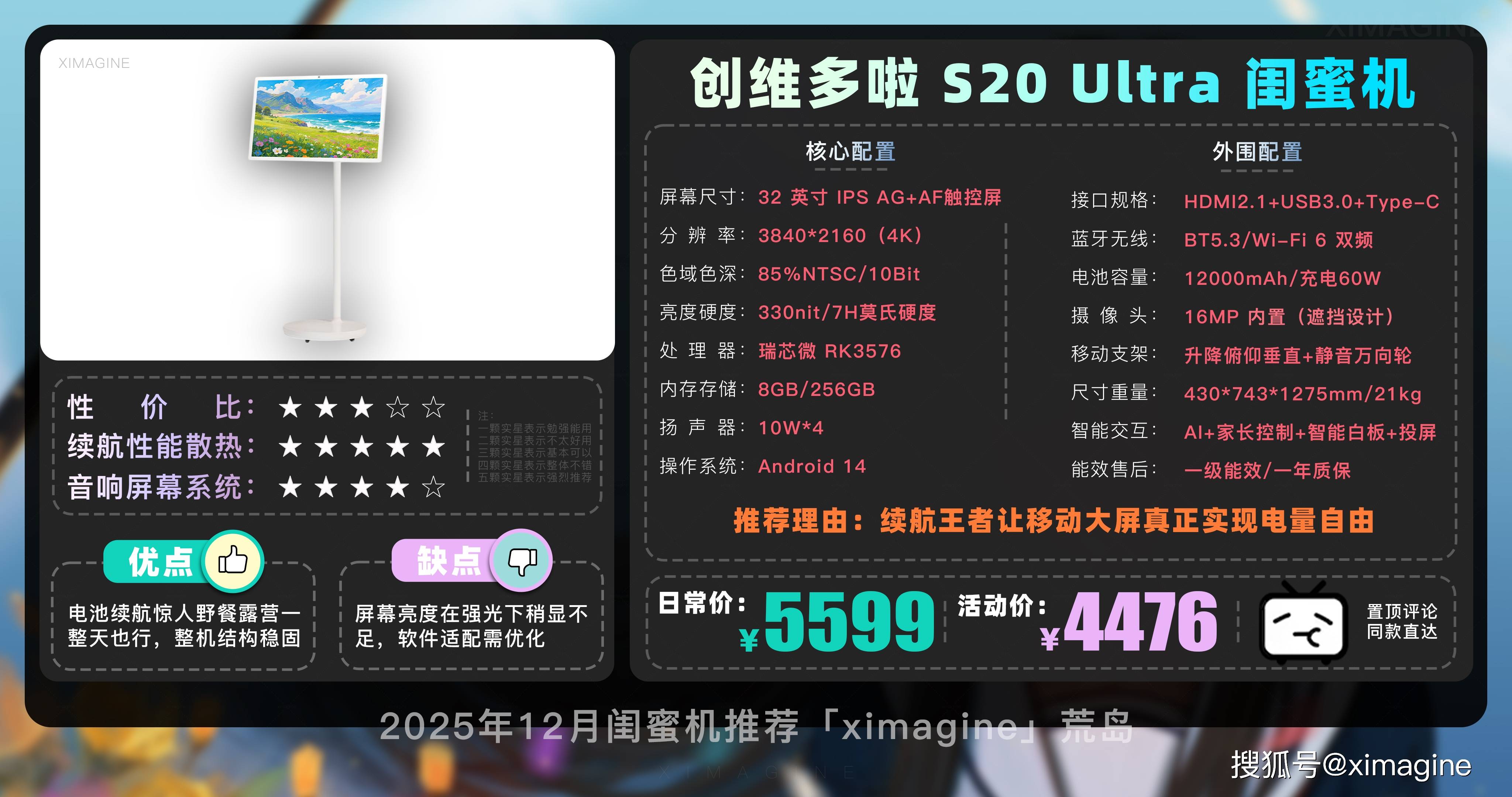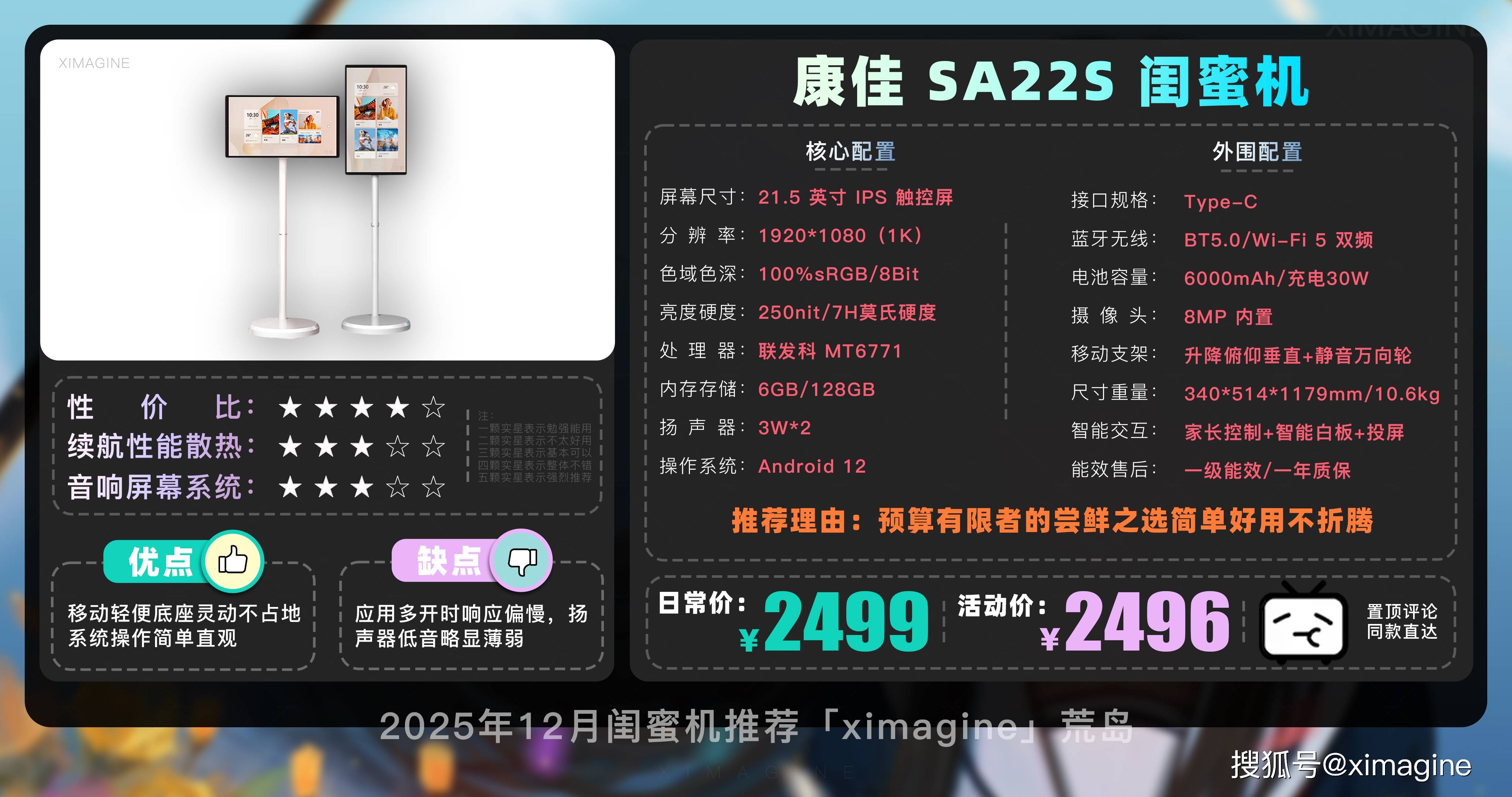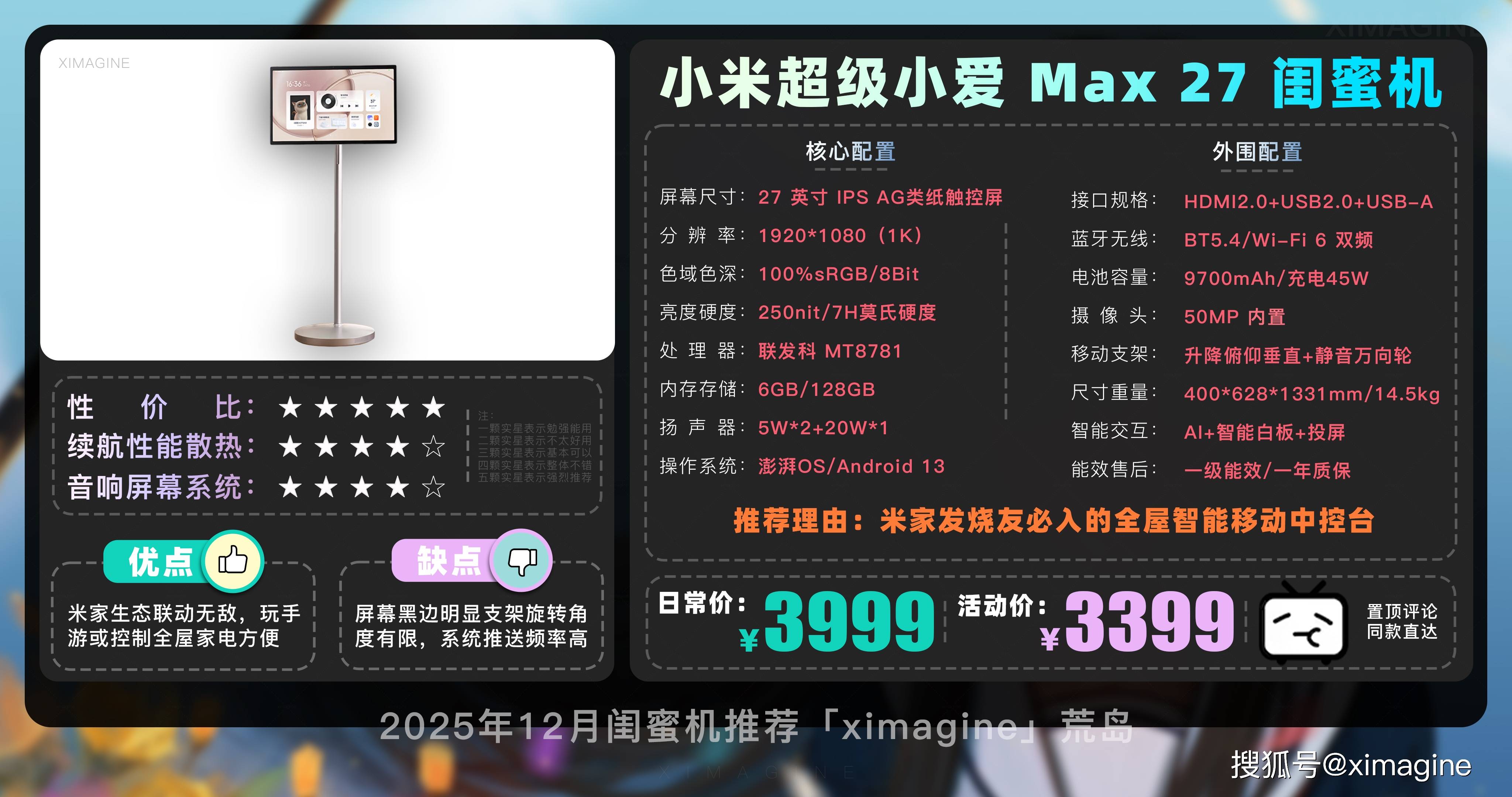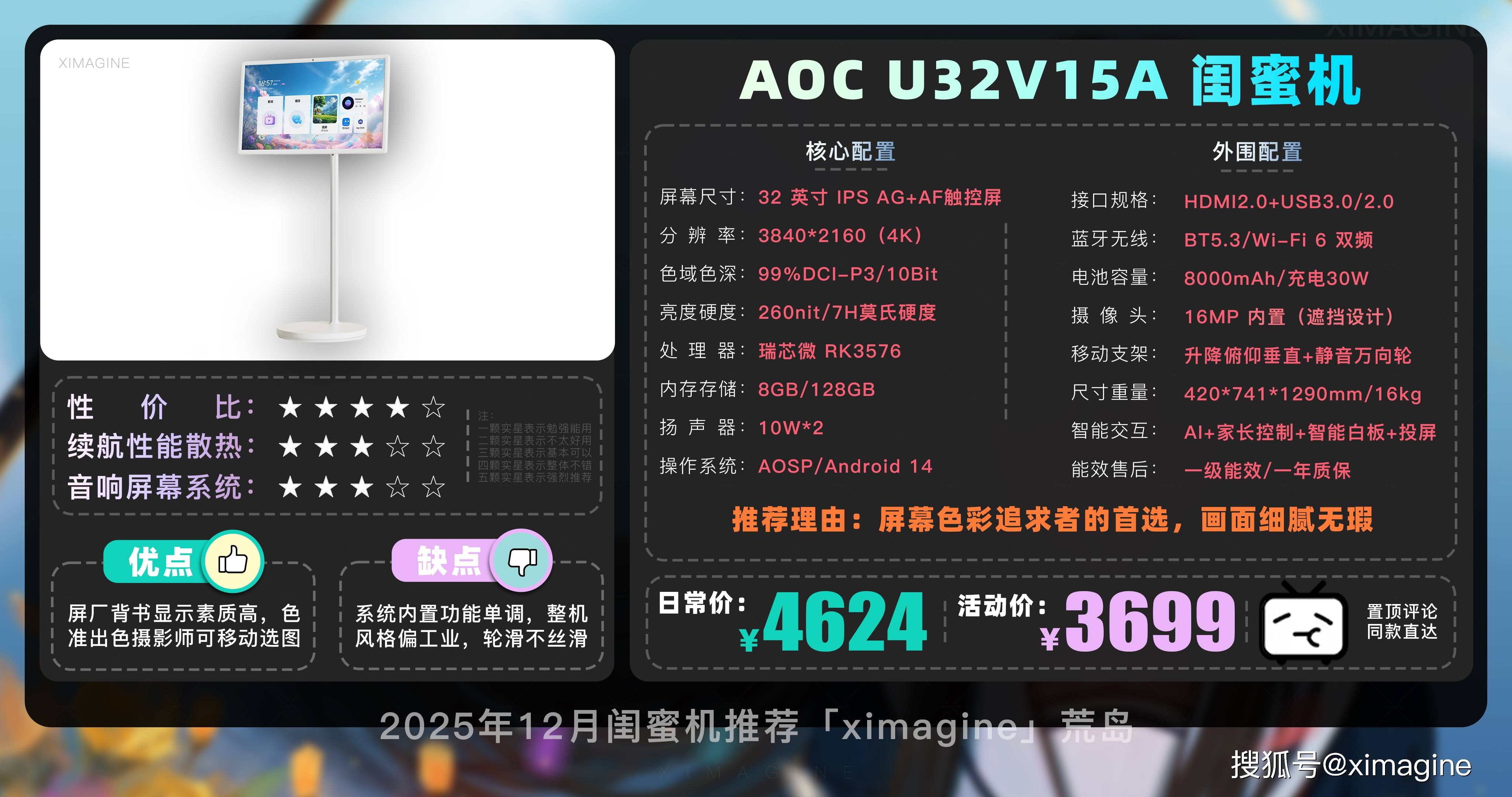 以上就是本期25年12月直播闺蜜机推荐清单,如果有心水的型号,可以戳置顶评论区对应链接拿下!如果只是想在出租房里有个下饭搭子,预算三千以内那些轻便系统简单的型号完全够用,如果对生活品质有执念,那四千元档位的全能型选手才是真命天子,至于追求极致画质和 AI 黑科技的朋友,一步到位旗舰款确实能让感受到科技带来的掌控感,本期就到这,如果觉得内容有所帮助,请三连支持!我是「ximagine」下期再会!返回搜狐,查看更多