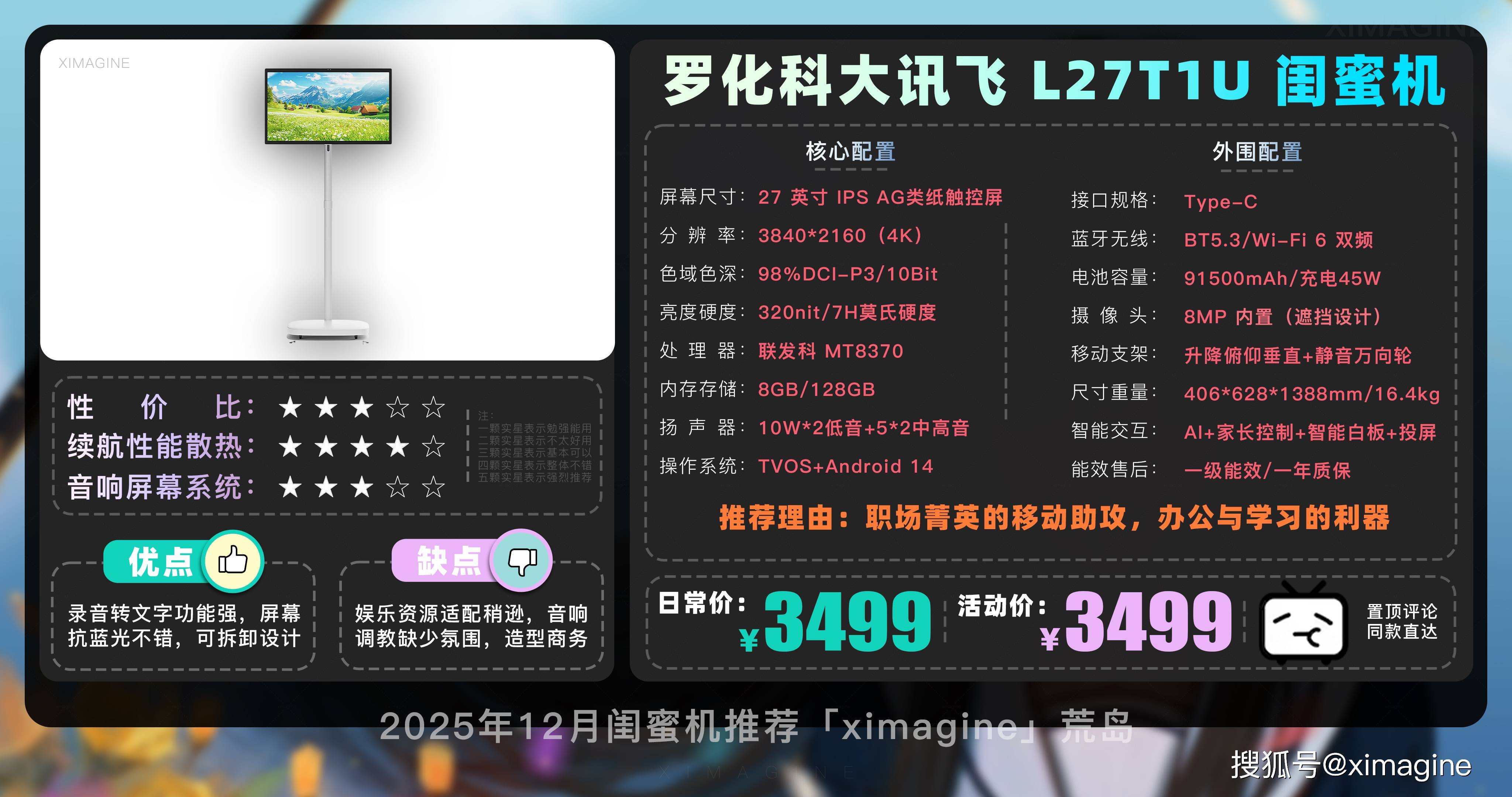 罗化科大讯飞 L27T1U 对于在校生或是需要整理纪要的职场人简直是开挂,讯飞的语音转文字功能在这么大的屏幕上展示出来,效率感拉满,在听讲座时把它放旁边,生成的转写稿几乎不用怎么大改就能出文案。屏幕色温较温和,盯着看两小时论文也不觉得累。虽然它的外形设计得稍微有点商务,音响也偏重人声而少了点音乐氛围感,但当需要高效率地搞定学习和工作任务时,这种务实的风格反而会让你觉得非常可靠,3499 元的它是文字工作者的强效助手。