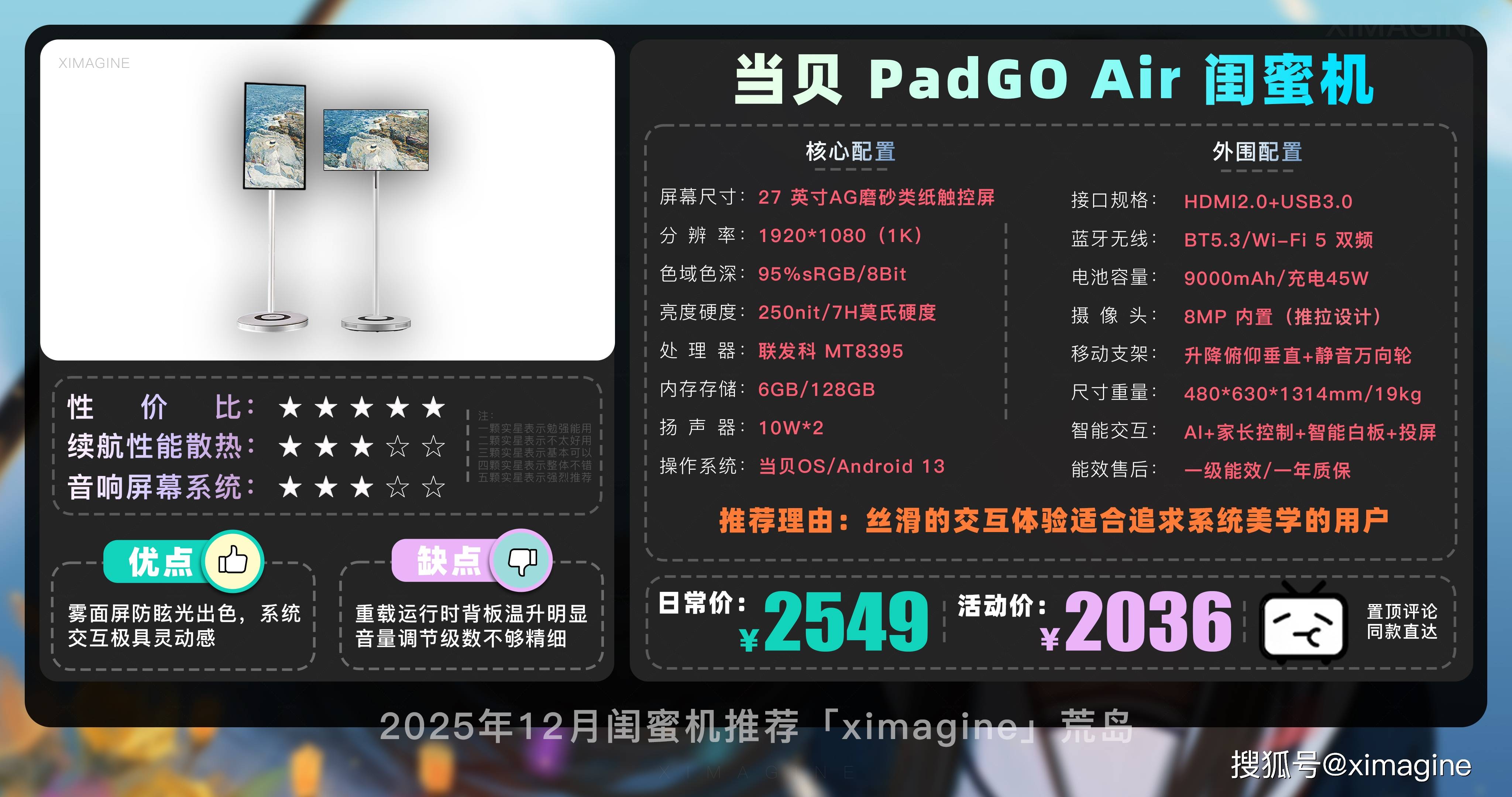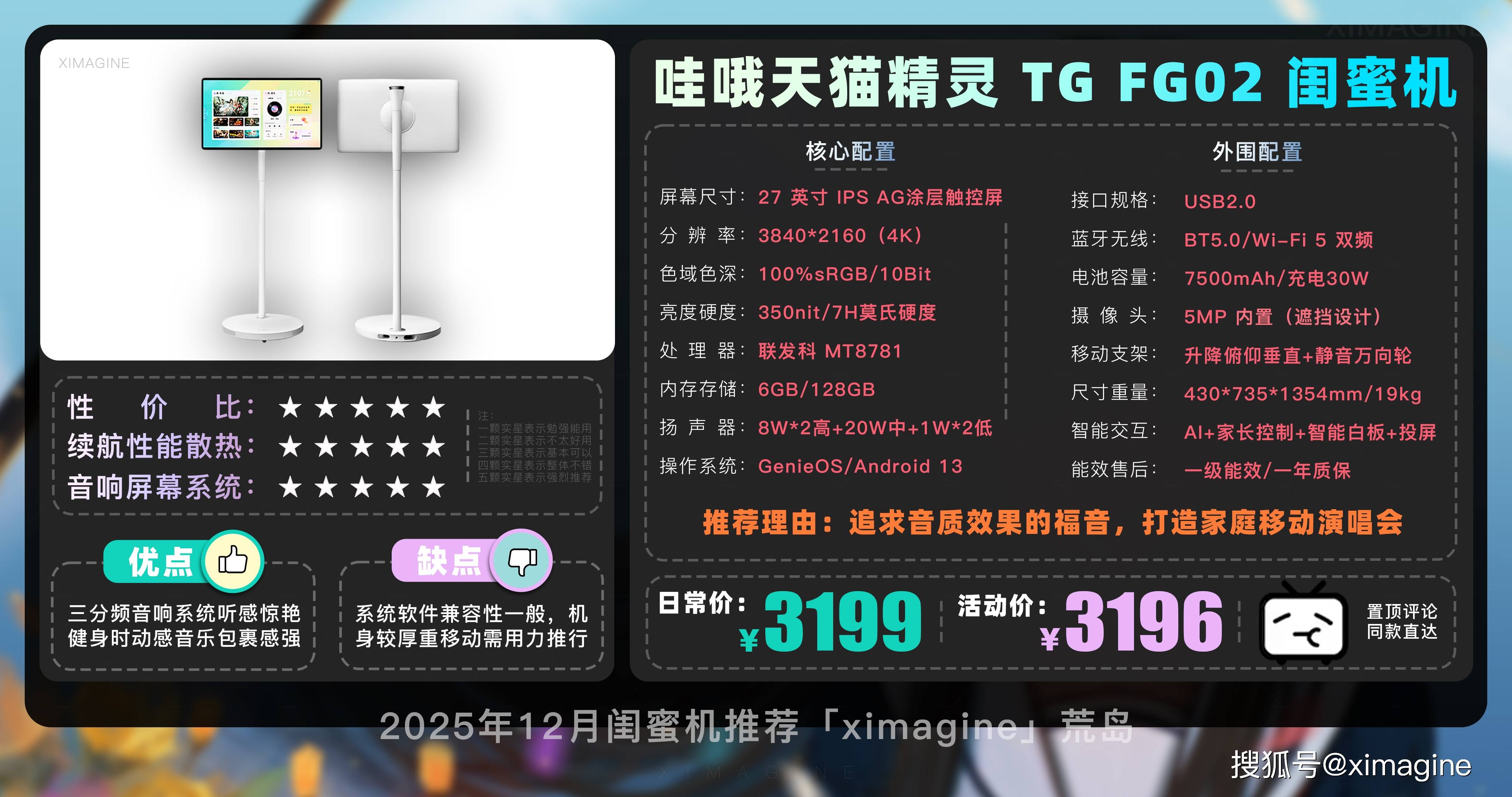 欢迎来到2025年12月直播闺蜜机推荐合集!我是「ximagine」这个能推着满屋跑的大平板到底是不是智商税?其实闺蜜机的诞生,精准踩中了懒人痛点,是把大屏的视觉享受和平板的自由随身给缝合在了一起,打破了空间边界可以边泡澡边刷剧,或边练瑜伽边看私教,但这个新品类现在卷得厉害,如果只看那些花里胡哨的宣传,买回来可能会是吃灰的晾衣架。大家可以参考我踩坑总结后的选购技巧,第一屏幕效果和存储配置,闺蜜机到处移动难免碰到灯光直射的情况,所以得看屏幕涂层处理,AF 防指纹防油易清洁,AR 抗反射增加透光率,追求阅读感认准类纸屏或 AG 磨砂处理,虽然通透度差点但柔和感挺护眼,存储配置都往大了选别让它拖了体验后腿;第二续航和轮组,关注电池容量的同时也要看充电速度,有的电池大但充电慢得离谱体验割裂,还得关注底座的万向轮,手感顺滑静音无声的橡胶包裹轮才是加分项;第三支架和系统生态,支架不仅要能升降旋转更要看它的仰角调节角度,开放系统可以拓展更多功能,全面投屏协议和手机一键镜像以及AI功能都能丰富使用场景。本期我把这十八款机器分成了三个价位段,看看哪台才是真的懂你,哪台只是在收割你的钱包,话不多说,正餐开始!