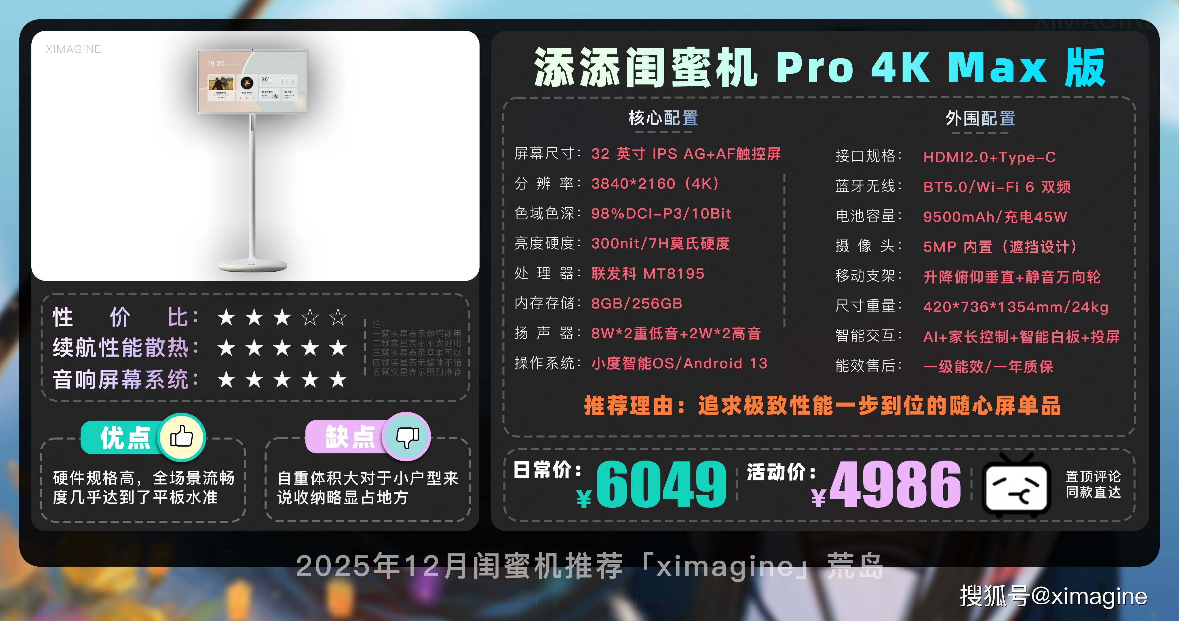 添添闺蜜机 Pro 4K Max 代表了目前硬件配置的天花板,系统滑动起来就像操作旗舰手机,没有任何掉帧,屏幕色彩非常鲜艳且过渡自然,看风光片时那种层次感简直是视觉盛宴,虽然售价确实会让很多人在购买前劝退,但如果你是一个不求性价比、只求极致的玩家,买它就意味着你在未来几年内都不需要考虑升级, 4986 元的它是闺蜜机领域的顶峰,服务于那些只要最强性能的人群。