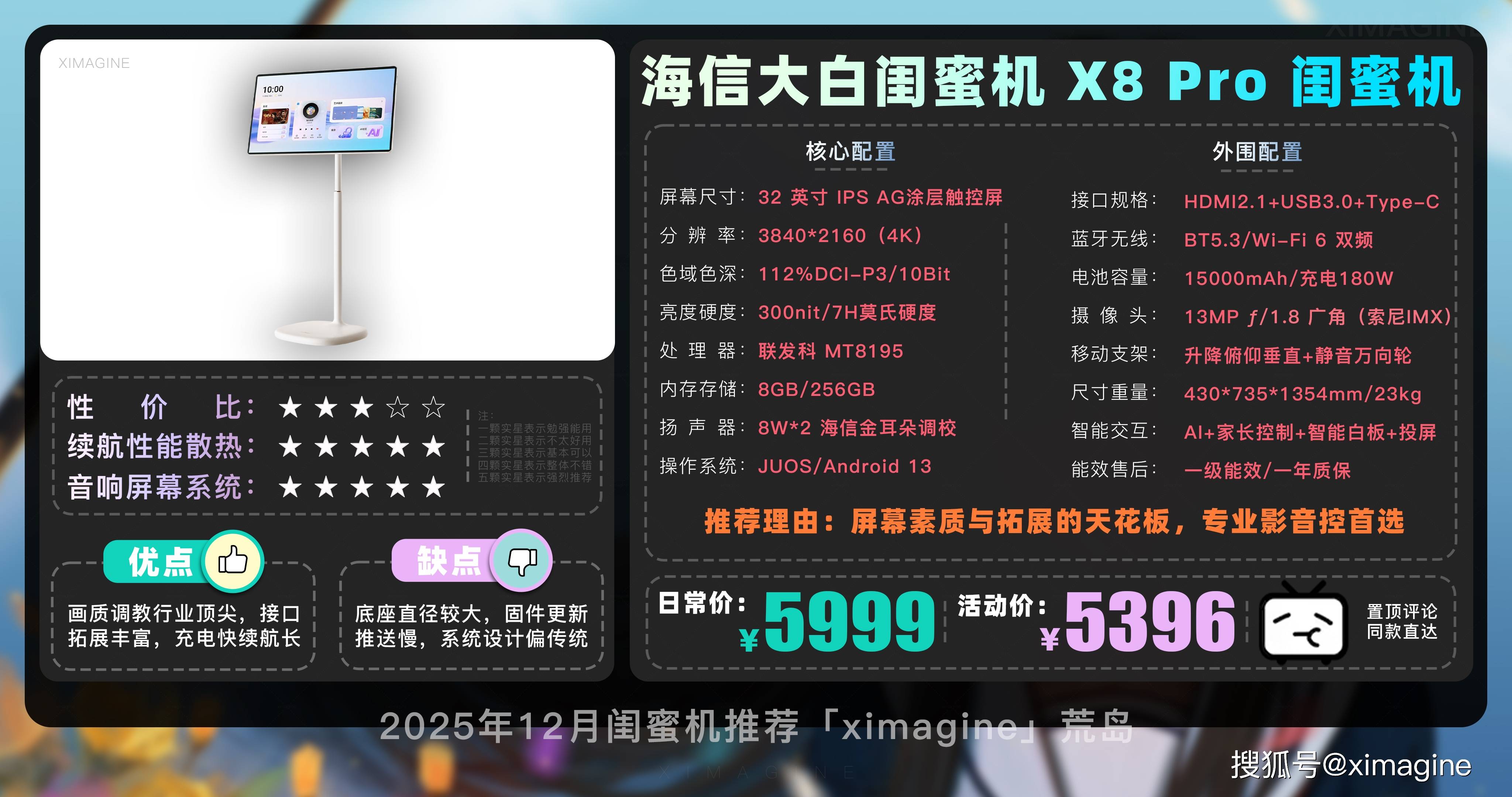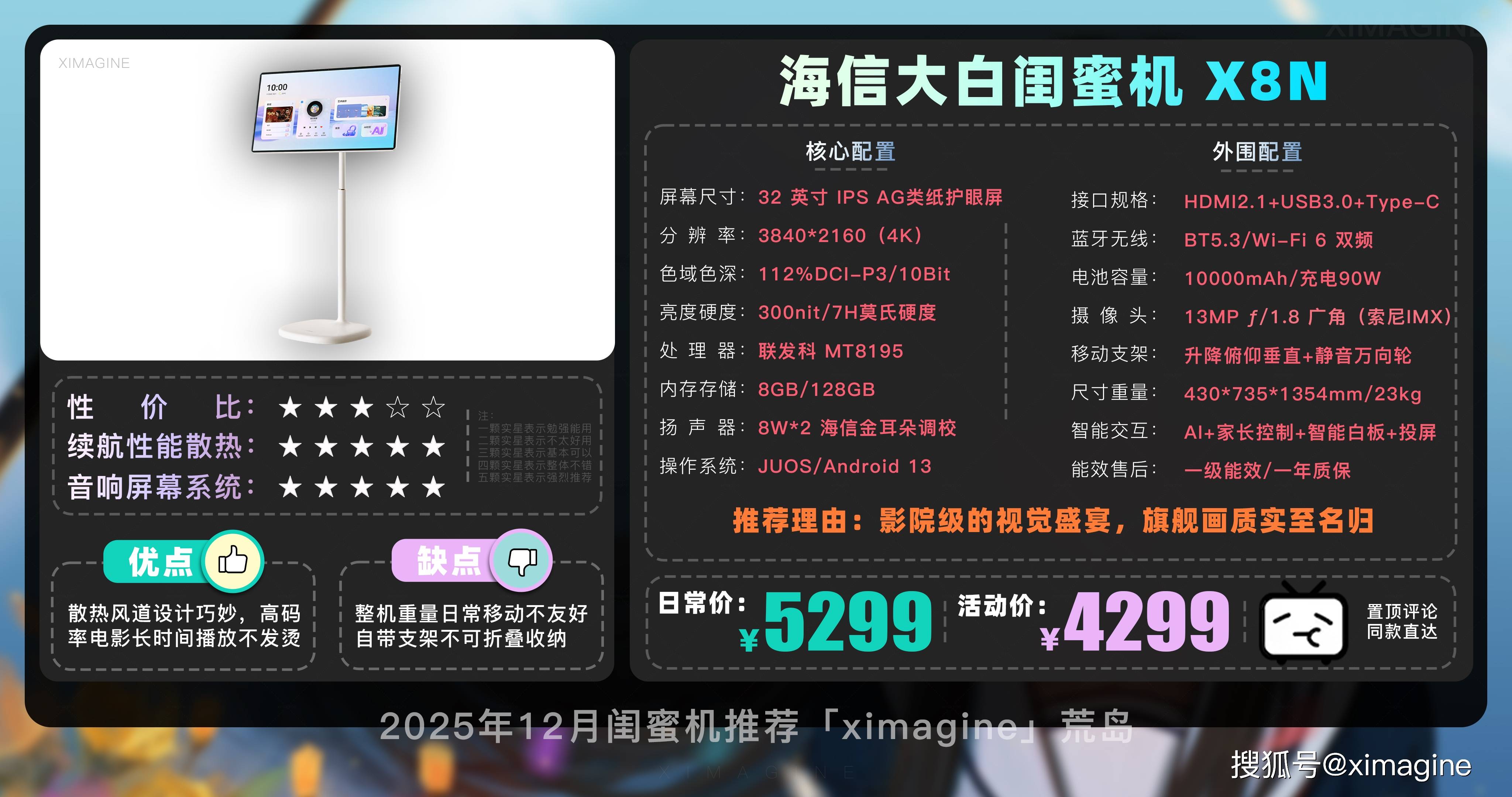海信大白闺蜜机 X8N 简直是移动私人影院”的终极形态,看大片时演员额头的细纹都清晰可见。最惊艳的是它的散热表现,连看三部大片机身背面也只是温热,完全没有风扇狂转带来的焦躁感。陶瓷质感的白壳不仅看着尊贵,摸上去更是细腻。虽然它重得像个小冰箱,想推着它满屋跑确实需要一点麒麟臂,但只要屏幕亮起的那一刻,那种极致的细腻画质会让你觉得,为了这享受多使点劲也值了,4299 元的它是目前闺蜜机界的画质天花板。
