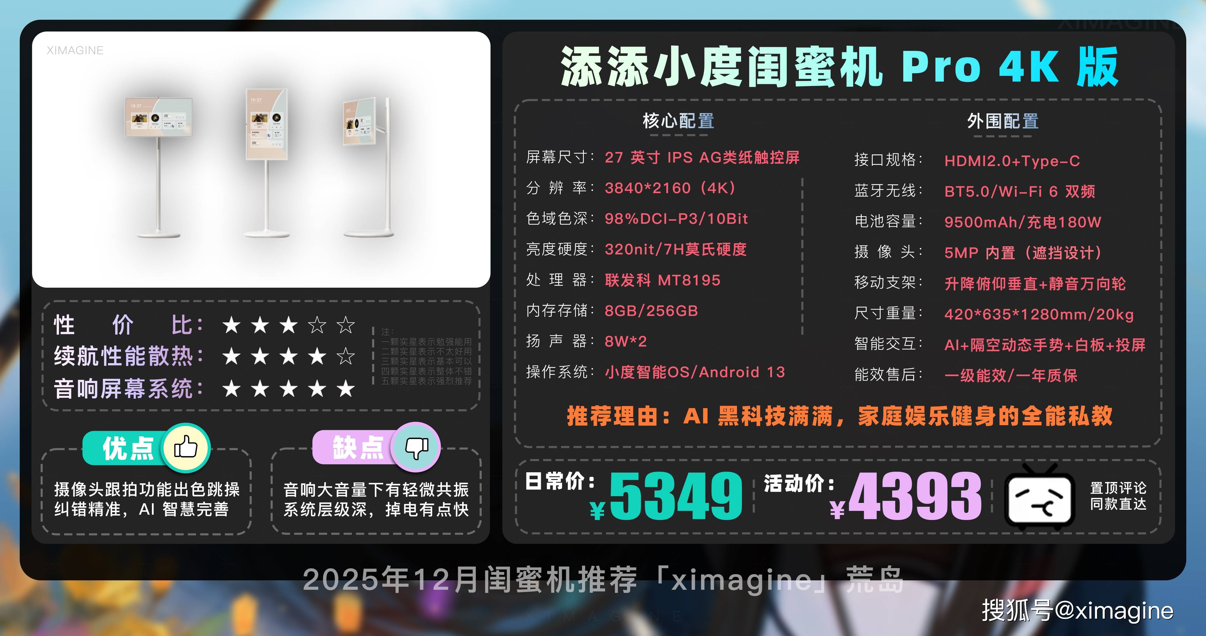 添添小度闺蜜机 Pro 4K 版不仅仅是一台屏幕,更像是一个智慧健身中心,顶部高清摄像头配合 AI 算法,真的能像私教一样盯着你跳操,动作不标准还会提醒,屏幕的显示效果锐利,操作系统的响应速度快,支架调节角度大得惊人,可以斜躺在瑜伽垫上看,也可以站着看。虽然大功率运行下续航会打折扣,但 4393 元的它集娱乐、健身、学习于一体的旗舰感,确实能让你觉得生活品质直接提升了一大截。