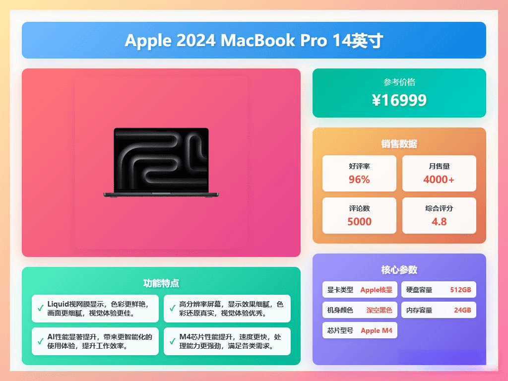①强劲芯片:采用全新的M4系列芯片,包括M4、M4 Pro和M4 Max,性能提升高达3.4倍,无论是日常办公还是图像处理都能轻松应对,打破了以往的速度瓶颈,工作效率明显提高。