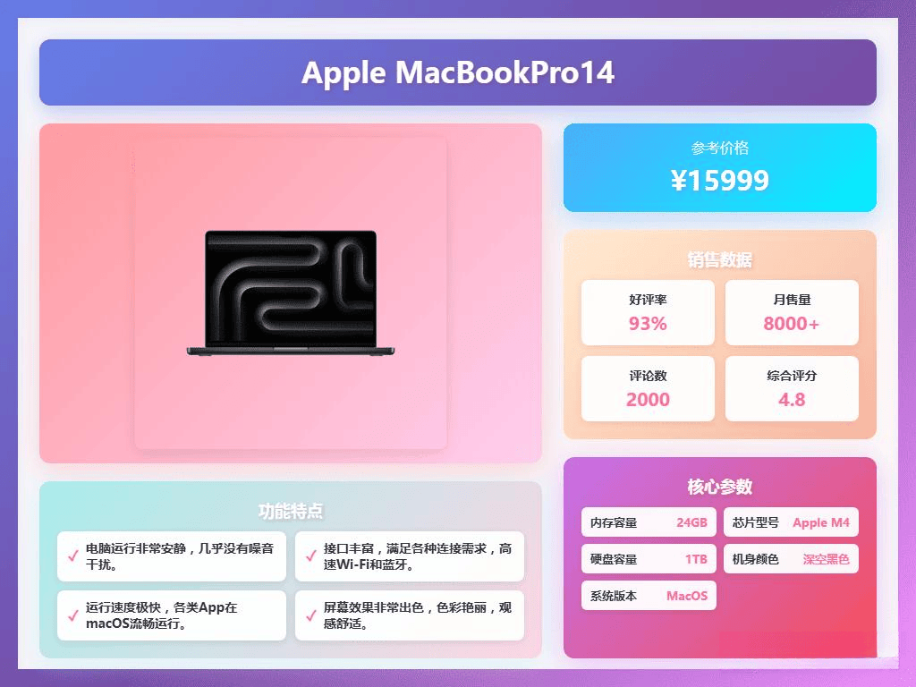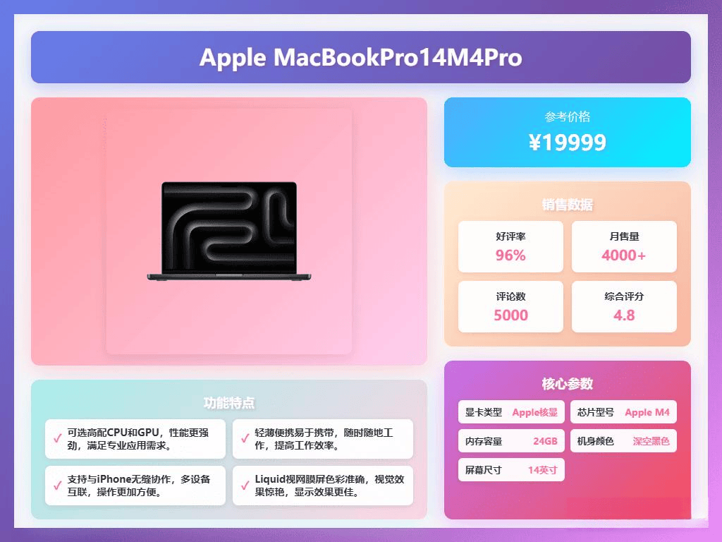 ①强劲性能:这款MacBook Pro搭载Apple M4芯片,性能提升明显,比之前的版本快了不少,基本无惧各种日常任务和专业软件。无论是编辑图片还是运行大型程序,都能轻松应对,效率提升显著。
