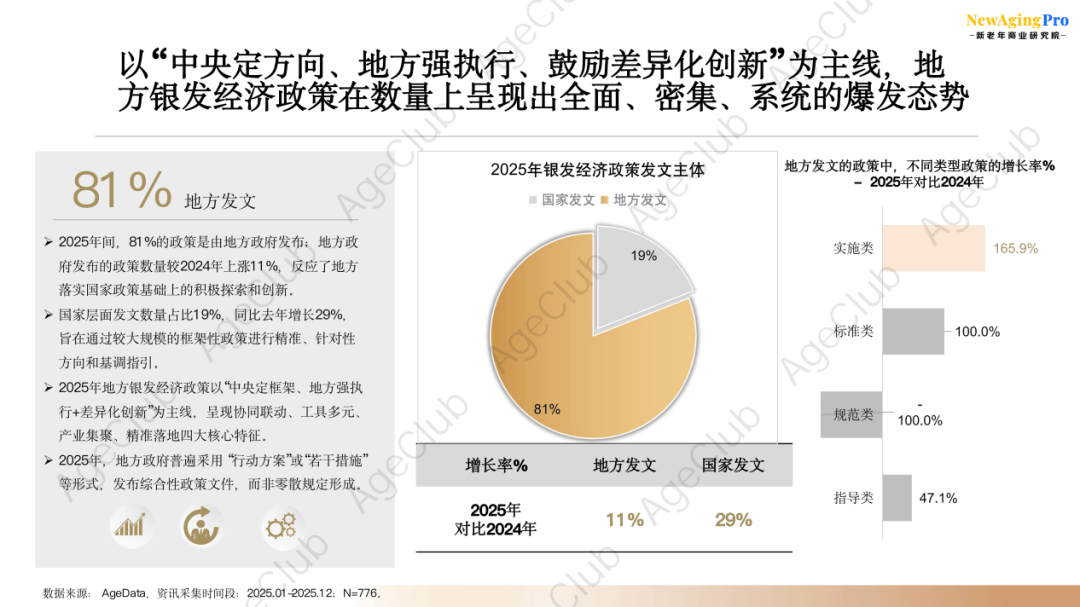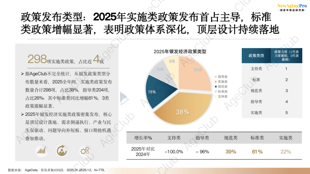 据AgeClub不完全统计,从银发政策类型分布数量来看,2025全年间,实施类政策发布数量合计298项,占比38%,指导类204项,占比26%;同比2024年标准类政策发布量上升显著,表明整体政策从前期定框架进入到落地执行阶段。