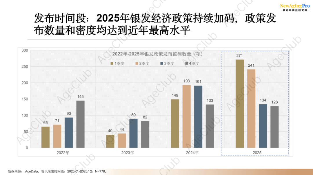 本期报告中,AgeClub选取2025年全年动态监测的银发政策相关资讯,着重从政策发布时间段、国家VS地方等角度进行独家分析解读,总结梳理2025年银发经济政策发力点。