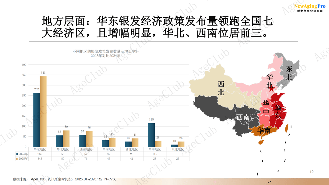从分地区来看,2025年华东地区全年发布343项银发经济政策,领跑七大经济区。华北地区、西南地区位列第二、第三名。