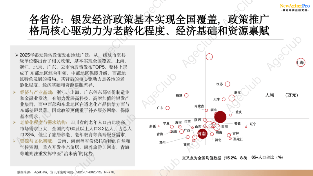 从各省表现来看,2025年银发经济政策基本实现全国覆盖。上海、浙江、北京、广东、云南政策发布量位列TOP5.整体上形成了东部地区综合引领、中部地区保障升级、西部地区特色发展的格局,其背后的核心驱动力是各地的老龄化程度、经济基础和资源禀赋差异。