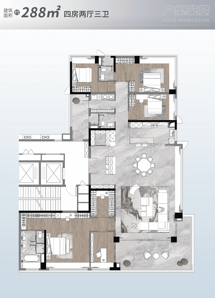 B 区 288㎡的 4 房 3 卫户型位于 36 座 2 梯 2 户,南北对流专梯专户 4 房设计。价格区间在 4.5 - 5.5 万 /㎡,总价约 1300 万起。L 型转角客厅开间一面约 8 米,另一面约 13.1 米,实现线° 环幕式采光,坐在客厅沙发上,每一面都是明亮的风景。主卧对标顶奢酒店的总统套房打造三进式格局,极具仪式感,整个南向开窗面约 10 米,不论是梳妆、沐浴、休憩,整片湖面皆可尽收眼底。该户型将尺度、私密度和恢弘景致完美融合,为住惯了豪宅的塔尖人物提供了心动神驰的终极大宅。空间布局合理,功能齐全,客厅、餐厅、卧室等区域都展现出极致的奢华与舒适,是高端品质生活的象征。