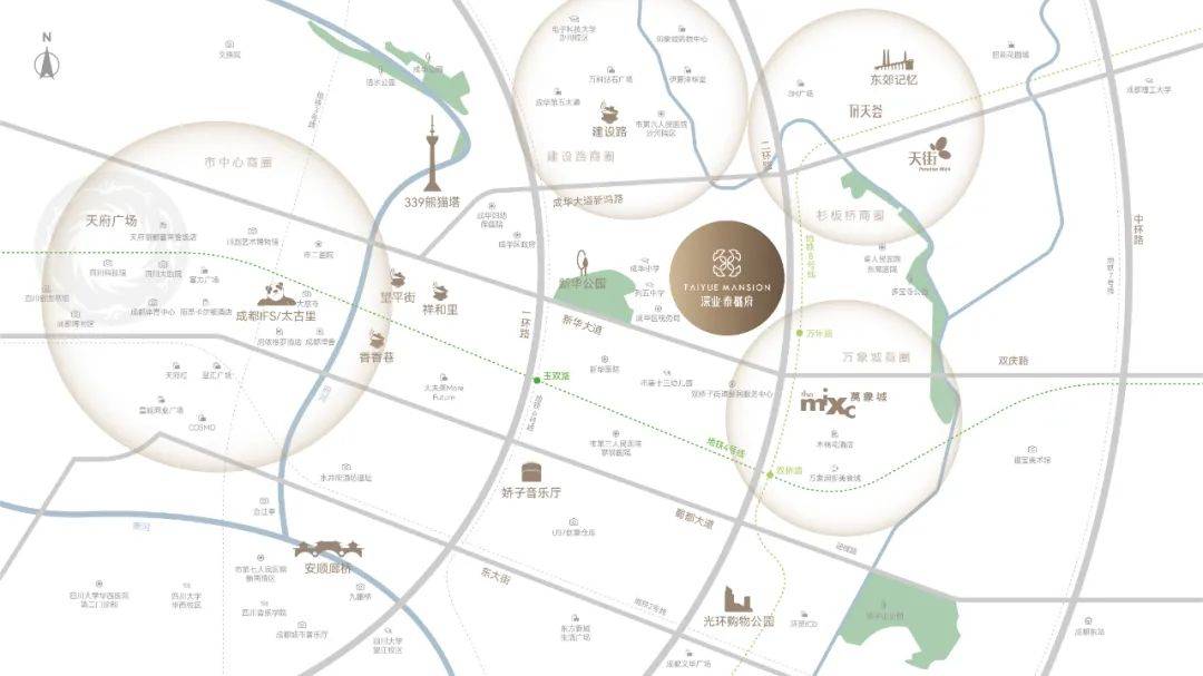 成都的二环,宛如这座城市的历史脉络,承载着深厚的文化底蕴。它在盛唐时期就以“扬一益二”的辉煌闻名于世,千年来,又在市井烟火的熏陶下,凝聚出最具成都特色的生活气息。这条黄金环线,无疑是成都珍贵记忆资产的汇聚之地。深业泰樾府所处位置得天独厚,贯通一环与二环,紧邻东门大桥、杉板桥等热门区域,妥妥位于二环内核心片区。而且,项目的两端分别有339和万象城这两大地标性综合体坐镇,进一步提升了区域的价值与影响力。周边配套: