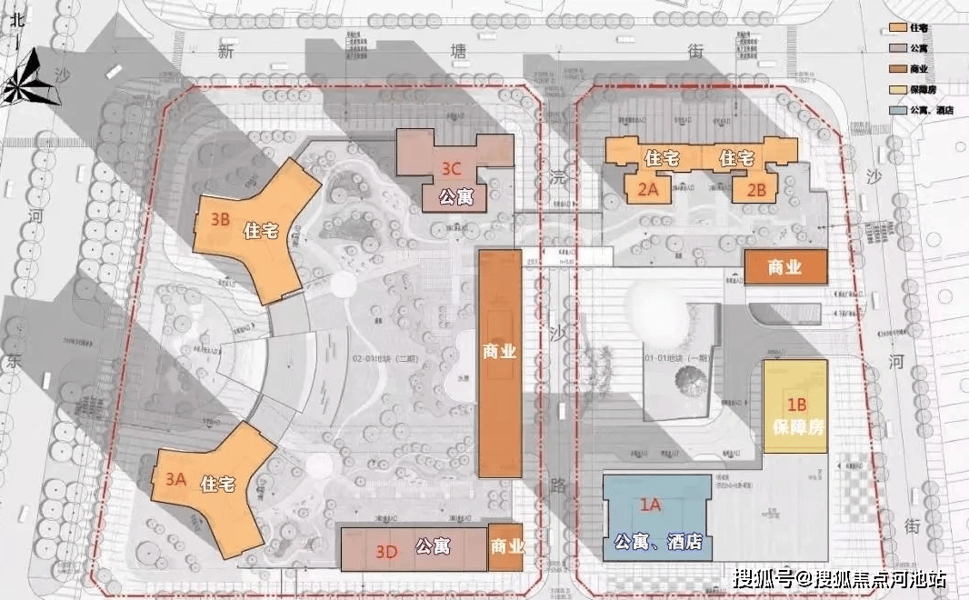 项目规划总占地4.2万㎡,容积率6.63,分为两期不同地块。一期为1栋A座为150米高公寓+酒店、1栋B座为92米高保障房、2栋A/B座位为138米回迁住宅。