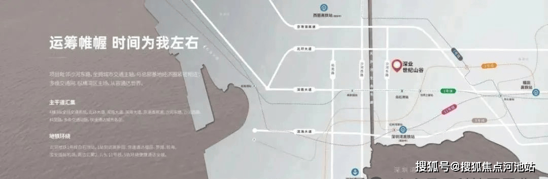 六轨四横三纵多枢纽:项目毗邻沙河东路,950米达深南大道;驾车1.5公里进入北环大道,坐拥城市交通主轴,与总部经济圈紧密相连,邻近地铁1号线站到达高新园,毗邻地铁29号线白石洲北站(建设中),周边六轨环绕,纵横湾区主场,从容通达世界。