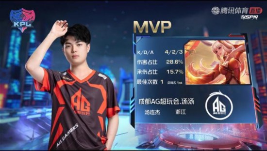 双方回到河道附近,公孙离一波三联决胜,送给WB.TS一波团灭。随后成都AG超玩会,连下两塔,推掉水晶,逆天翻盘赢得胜利。第一局MVP给到汤汤的公孙离。